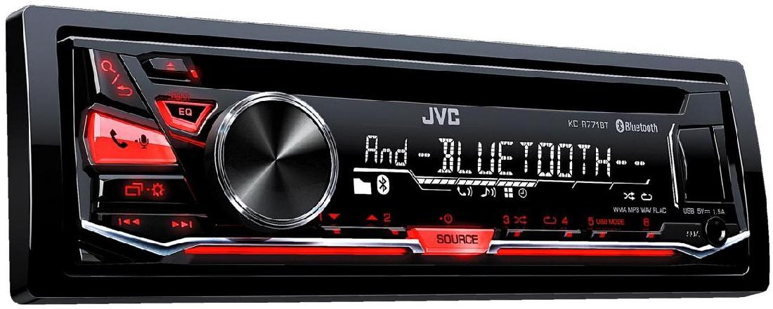 JVC KD-R771BT BLUETOOTH, FLAC CD-MP3-ресивер с поддержкой по USB только ANDROID,c USB-входом и усилителем MOS-FET, 3-полосным эквалайзером, 50 Вт х 4 канала (макс при КНИ <=1%) и 20 Вт х 4 (RMS), ФНЧ и тонкомпенсация, Вход USB и AUX, Cъемная передняя панель, Возможность управления пультом RM-RK52 (приобретается отдельно), Разъем для управления кнопками на руле автомобиля при помощи адаптеров Paser, Таймер на включение радиопрограммы однократный, ежедневный, еженедельный; Память на радиостанции на случай отключения питания, Совместимость с форматами записи MP3, WMA и WAV FLACK (только с USB) Технология К2, Случайный выбор/повторное воспроизведение, Подача питания 1A на подключенное устройство, USB mass storage class для музыкальных файлов (кроме NTFS, только 1 раздел, ток 1А), 24-битовый ЦАП, Пара линейных выходов c уровнем 2.5 Вт с регулировкой уровня, переключаемая задние колонки/сабвуфер с регулируемым уровнем и частотой среза.