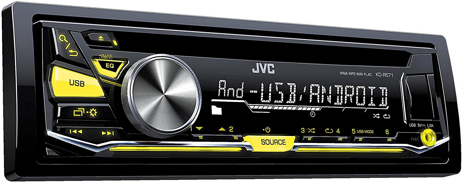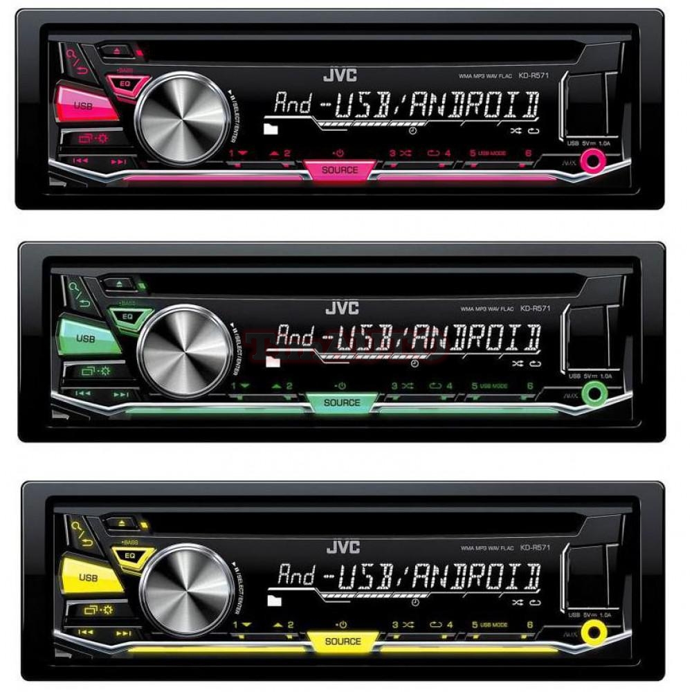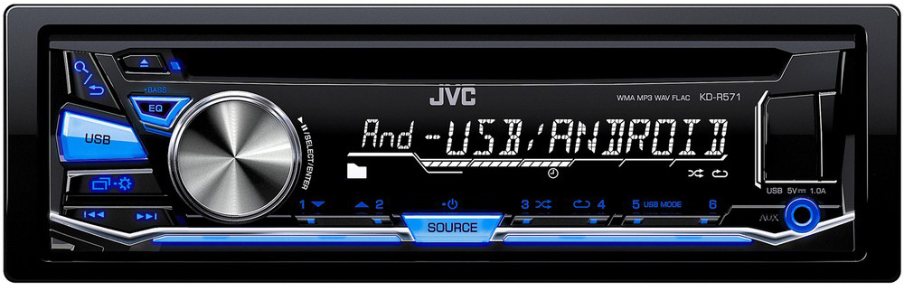 JVC KD-R571 FLAC CD-MP3-ресивер с поддержкой русского языка, изменяемой подсветкой кнопок (символы-белые), USB-входом с усилителем MOS-FET, 3-полосным эквалайзером, 50 Вт х 4 канала (макс при КНИ <=1%) и 20 Вт х 4 (RMS), ФНЧ и тонкомпенсация, Вход USB и AUX, Cъемная передняя панель, Разъем для управления кнопками на руле автомобиля при помощи адаптеров Paser, Таймер на включение радиопрограммы однократный, ежедневный, еженедельный; Память на радиостанции на случай отключения питания, Совместимость с форматами записи MP3, WMA и WAV FLACK (только с USB), Случайный выбор/повторное воспроизведение, Подача питания 1A на подключенное устройство, USB mass storage class для музыкальных файлов (кроме NTFS, только 1 раздел, ток 1А), 24-битовый ЦАП, Пара линейных выходов c уровнем 2.5 Вт с регулировкой уровня, переключаемая задние колонки/сабвуфер с регулируемым уровнем и частотой среза.