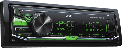 JVC KD-X143 FLAC, Зеленая подсветка, Русский язык, Съемная лицевая панель, Тюнер с цифровой обработкой с расширенным УКВ диапазоном (65-74, 87,5-108 МГц) и диапазонами AM (СВ 531-1620 кГц, ДВ 153-279 кГц), Вход USB на передней панели, Совместимость с форматами записи MP3, WMA, WAV и FLAC, Случайный выбор/повторное воспроизведение, Подача питания 1A на подключенное устройство, USB mass storage class для музыкальных файлов (кроме NTFS, только 1 раздел, ток 0.5А), Усилитель на полевых транзисторах MOS-FET, 16-битовый цифро-аналоговый преобразователь, Максимальная выходная мощность 50 Вт на 4 канала, Номинальная выходная мощность (RMS) 22 Вт на канал при 4 Ом (допустимо 8 Ом) нагрузки, 40-20000 Гц при не более 1.0% общих гармонических искажений, 3-полосный параметрический эквалайзер iEQ с легкой установкой Easy EQ, память на звуковые настройки по каждому источнику Source Link EQ, 13 готовых настроек эквалайзера, Тонкомпенсация, ФНЧ, 1 пара линейных выходов 2,5 В, функция прямого подключения саббуфера, Управление кнопками на руле автомобиля с помощью адаптера.