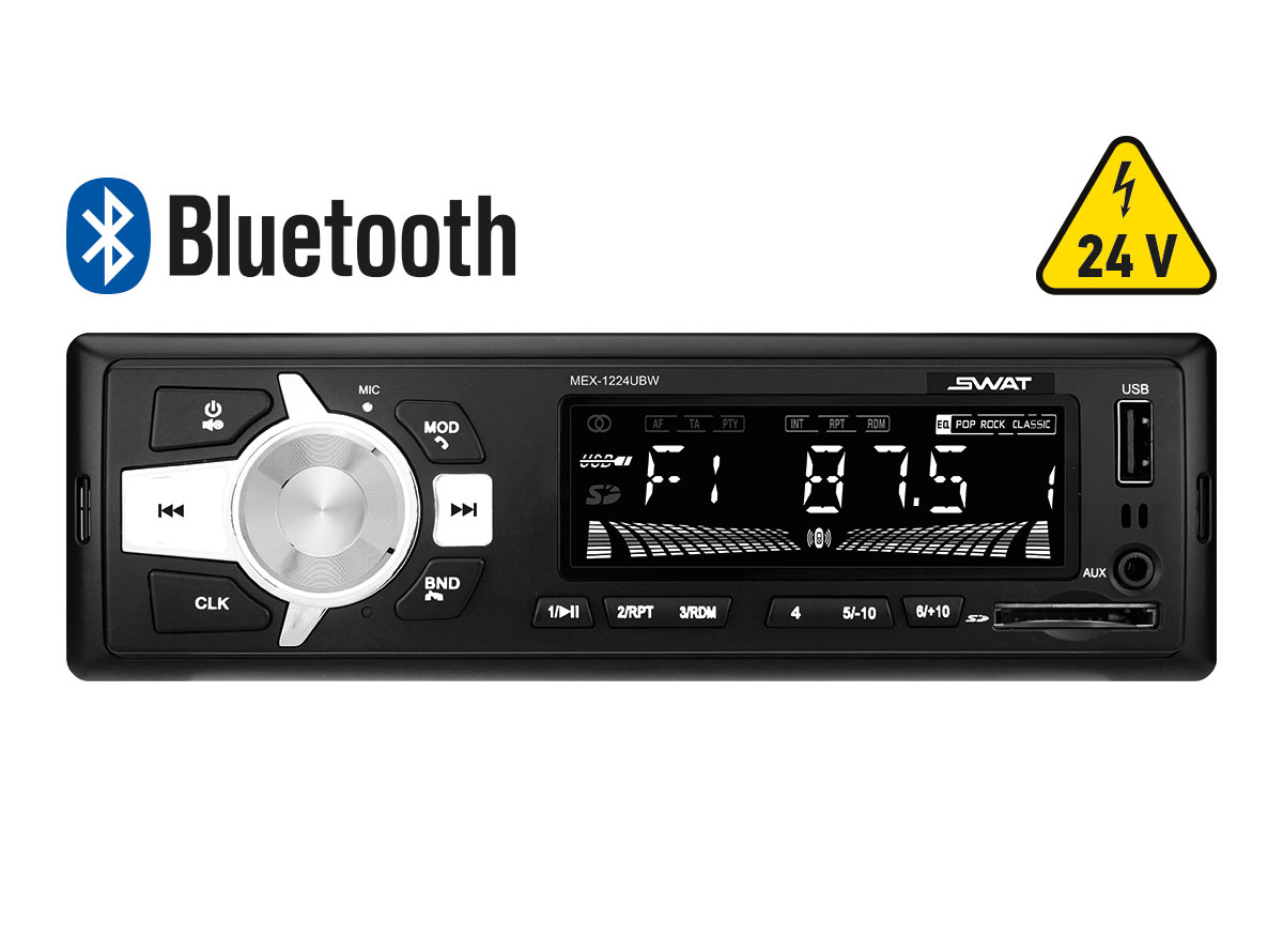 12-24 V-для ком.транспорта/1 din медиа ресивер, 4х45 Вт, BT,USB,SD, бел. кнопки