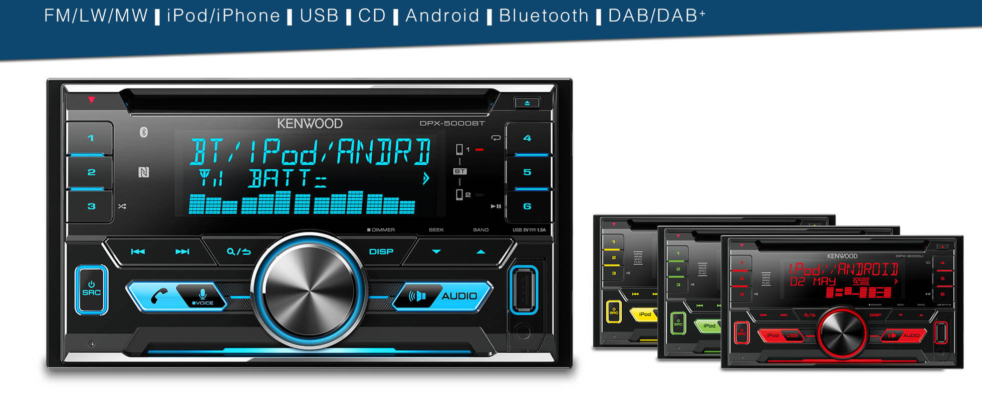 Kenwood DPX-3000U Изменяемая подсветка, FLAC, управление iPhone, Android, 2 пары линейных выходов