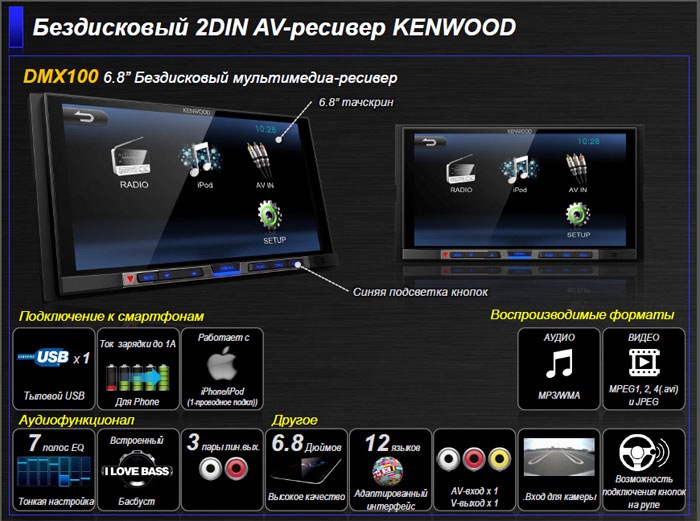 Kenwood DMX100 2 DIN Мультимедиа без диска, 50Втх4, высококачественный сенсорный экран wVGA (800x480) с диагональю 6,8", уверенный прием радиосигнала, тыловой вход USB с током зарядки до 1А, управление iPod/iPhone, воспроизведение аудио МР3/WMA и видео MPEG1,2,4, 7-полосный графический эквалайзер, 3 пары линейных выходов 2В, встроенный бас-буст, вход для камеры заднего обзора, 1 AV-вход, 1 видеовыход, возможность подключения кнопок на руле автомобиля