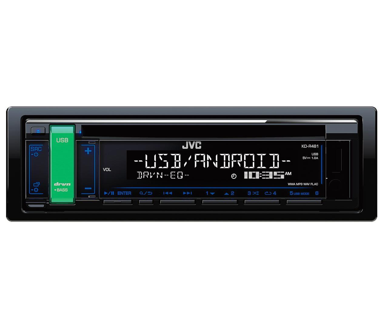 JVC KD-R481 FLAC CD-MP3-ресивер с НОВЫМ FLAT дизайном с изменяемой подсветкой кнопки выбора источника и c синей подсветкой кнопок (цвет букв дисплея белый) с поддержкой русского языка (выбрать в меню), USB-входом, усилителем MOS-FET, 3-полосным эквалайзером, мощностью 50 Вт х 4 канала (макс при КНИ <=1%) и 22 Вт х 4 (RMS), ФНЧ и тонкомпенсация, Вход USB и AUX, Cъемная передняя панель, Разъем для управления кнопками на руле автомобиля при помощи адаптеров Paser, Таймер на включение радиопрограммы однократный, ежедневный, еженедельный; Память на радиостанции на случай отключения питания, С
