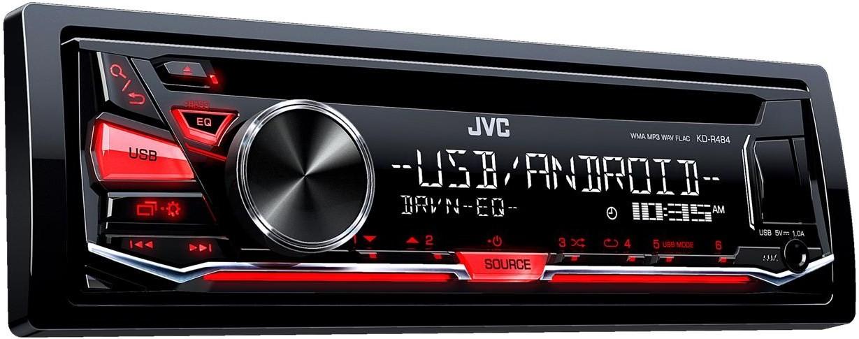 JVC KD-R484 FLAC CD-MP3-ресивер с НОВЫМ FLAT дизайном с изменяемой подсветкой кнопки выбора источника и c красной подсветкой кнопок (цвет букв дисплея белый) с поддержкой русского языка (выбрать в меню), USB-входом, усилителем MOS-FET, 3-полосным эквалайзером, мощностью 50 Вт х 4 канала (макс при КНИ <=1%) и 22 Вт х 4 (RMS), ФНЧ и тонкомпенсация, Вход USB и AUX, Cъемная передняя панель, Разъем для управления кнопками на руле автомобиля при помощи адаптеров Paser, Таймер на включение радиопрограммы однократный, ежедневный, еженедельный; Память на радиостанции на случай отключения питания,