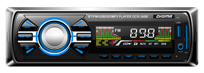 1DIN, USB-проигрыватель, USB, карты памяти, Bluetooth, усилитель 4x45 Вт, экран монохромный