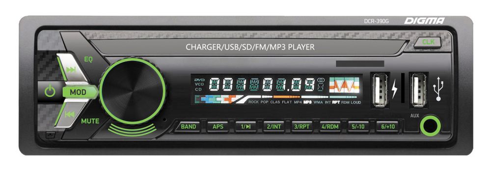 1DIN, USB-проигрыватель, USB, карты памяти, усилитель 4x45 Вт, экран монохромный