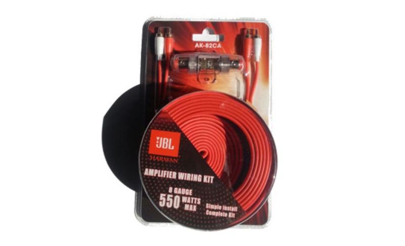 8 AWG CCA, установочный комплект JBL. Красный 5м, черный 1,5м, синий 16 AWG 5м, 2-х канальный провод RCA 5м JBL, колба ANL, предохранитель 50А, клеммы, стяжки.